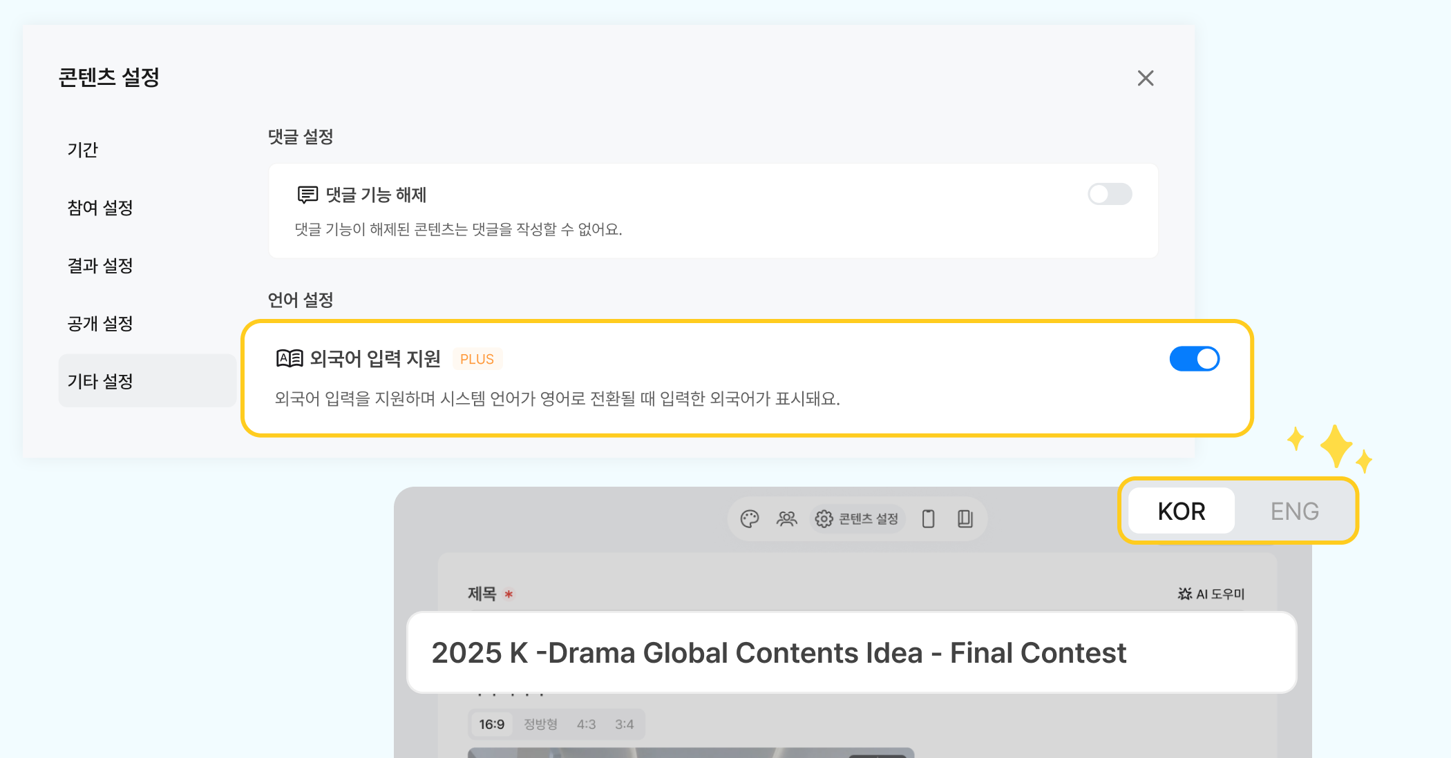 콘텐츠 제작 시, 한국어 외에 영어 문구를 추가 입력할 수 있습니다. 한 번의 설정으로 국내·해외 참여자에게 동시에 콘텐츠를 제공할 수 있어요. 아래의 방법으로 ‘외국어 입력 지원’ 옵션을 켜면, 탭을 전환하며 한국어와 영어 문구를 입력할 수 있습니다.