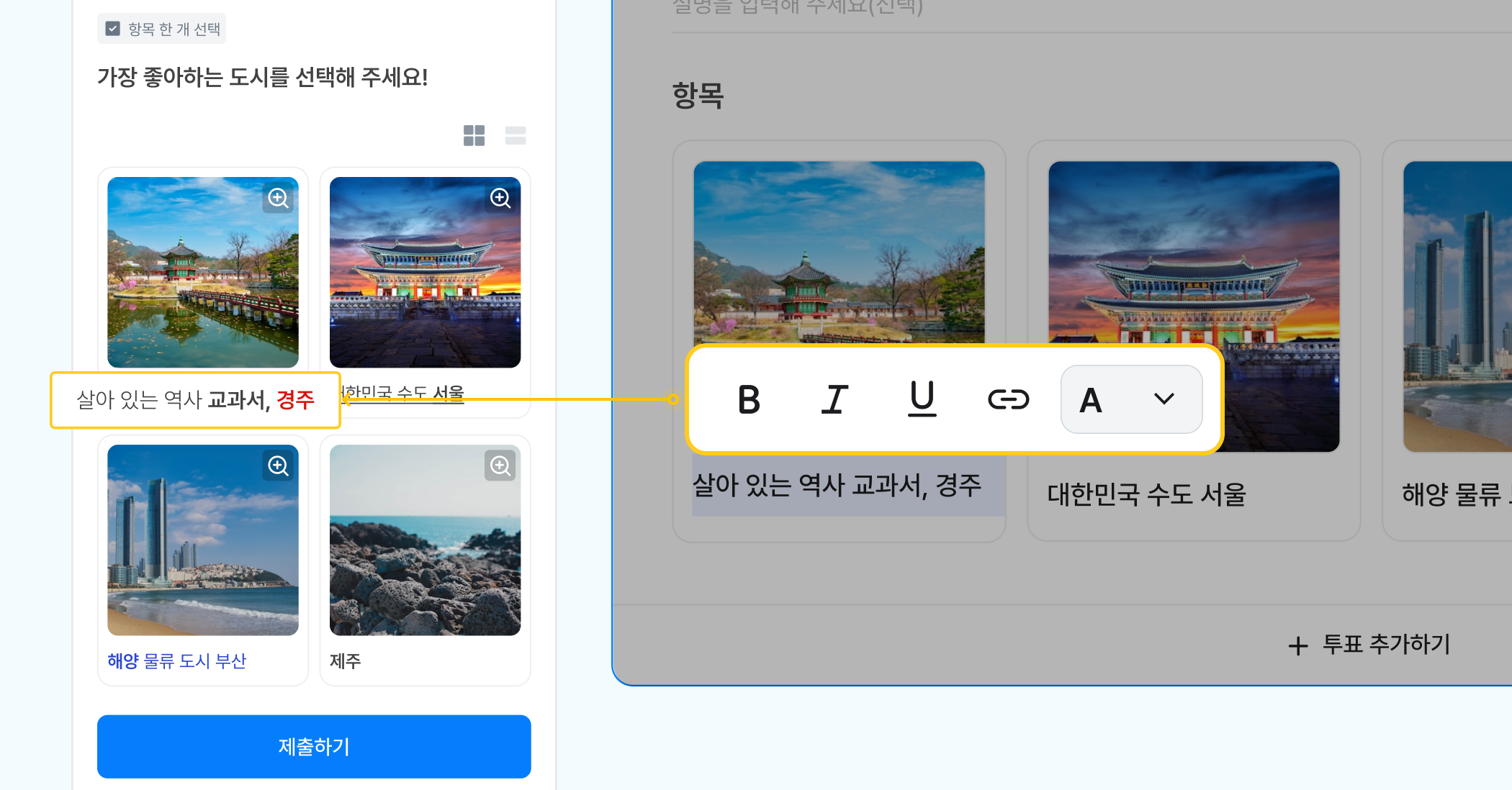 이제 투표나 설문을 만들 때 텍스트 서식 툴바를 사용할 수 있습니다. 항목 입력창의 텍스트를 드래그하면 툴바가 자동으로 나타납니다.