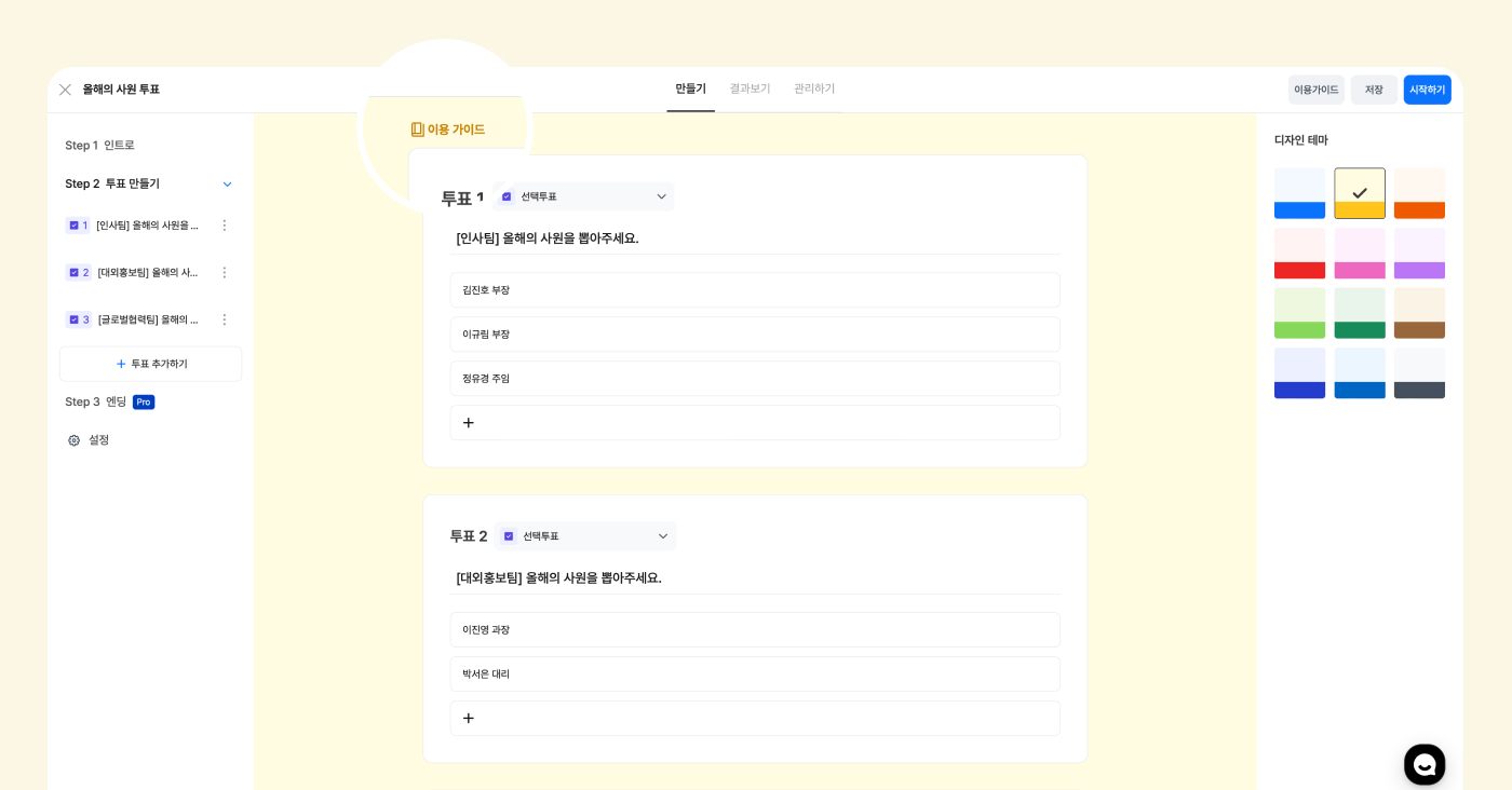 순위 투표 : 더 이상 1~10점 범위 내에서만 순위를 매길 필요가 없습니다. [1위 점수 > 2위 점수 > 3위 점수 > ...] 와 같이 순위가 내려갈수록 점수가 낮아지는 조건만 충족하면 됩니다. 이를 통해 참여자들은 더욱 세밀하게 선호도를 반영하여 순위를 결정할 수 있습니다.