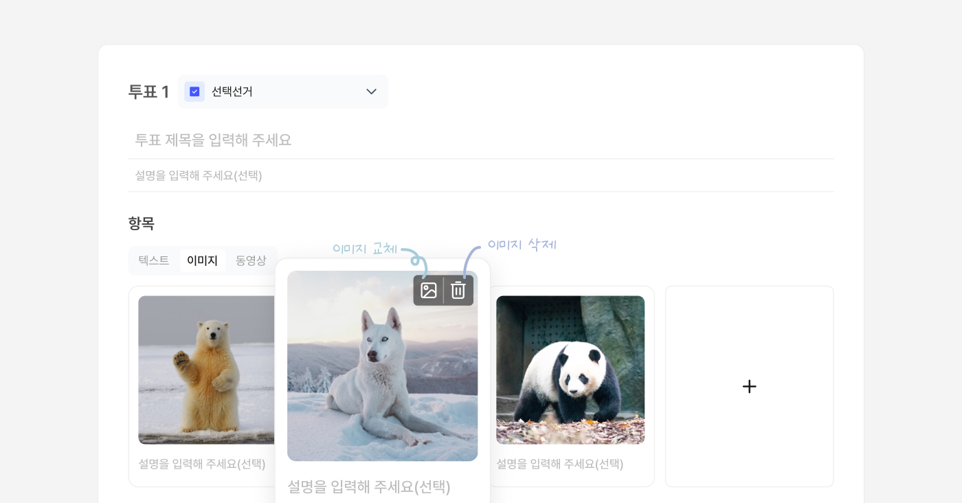 점수 투표 : [최소 점수 < 최대 점수]라는 기본적인 조건만 충족하면 어떤 범위의 점수든 설정할 수 있습니다. 예를 들어, 0~5점, 1~20점, 50~100점 등 원하는 범위로 자유롭게 설정하여 투표를 진행할 수 있습니다.