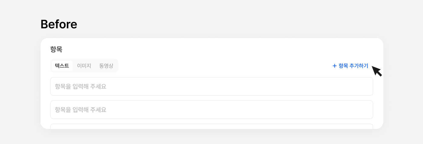 기존 방식에서는 항목을 입력한 후 다음 항목을 추가하기 위해 마우스를 화면 우측 상단으로 크게 이동해야 하는 불편함이 있었습니다. 특히 항목 수가 증가할수록 '항목 추가하기' 버튼과의 물리적 및 시각적 거리로 인해 반복 작업 시 피로도가 누적되는 문제가 있었어요. 이에, 사용자의 작업 흐름을 최적화하고 불필요한 움직임을 최소화하기 위해 인터페이스를 개선했습니다. 이제는 마우스 이동이나 시선 전환 없이도 연속적인 항목 추가 작업이 가능하여, 콘텐츠 제작에 더욱 집중할 수 있는 환경을 제공합니다.