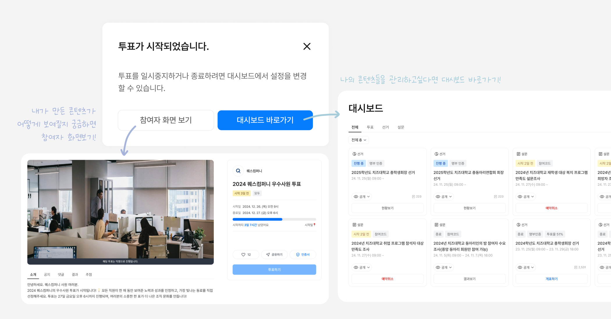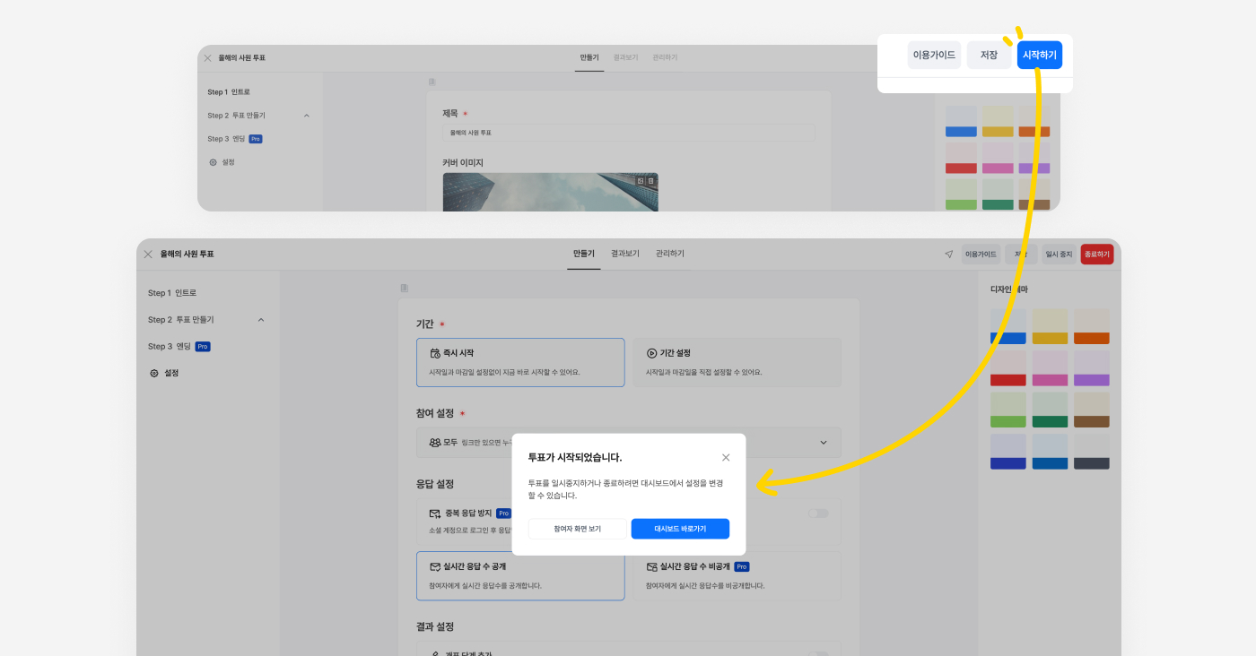 이전에는 콘텐츠를 제작한 후, 참여자들이 어디에서 해당 콘텐츠에 접근하고 참여할 수 있는지 직관적으로 파악하기 어려웠습니다. 이제 시작하기 버튼을 클릭하면, 콘텐츠 제작 후의 주요 액션을 바로 선택할 수 있도록 개선되었습니다.