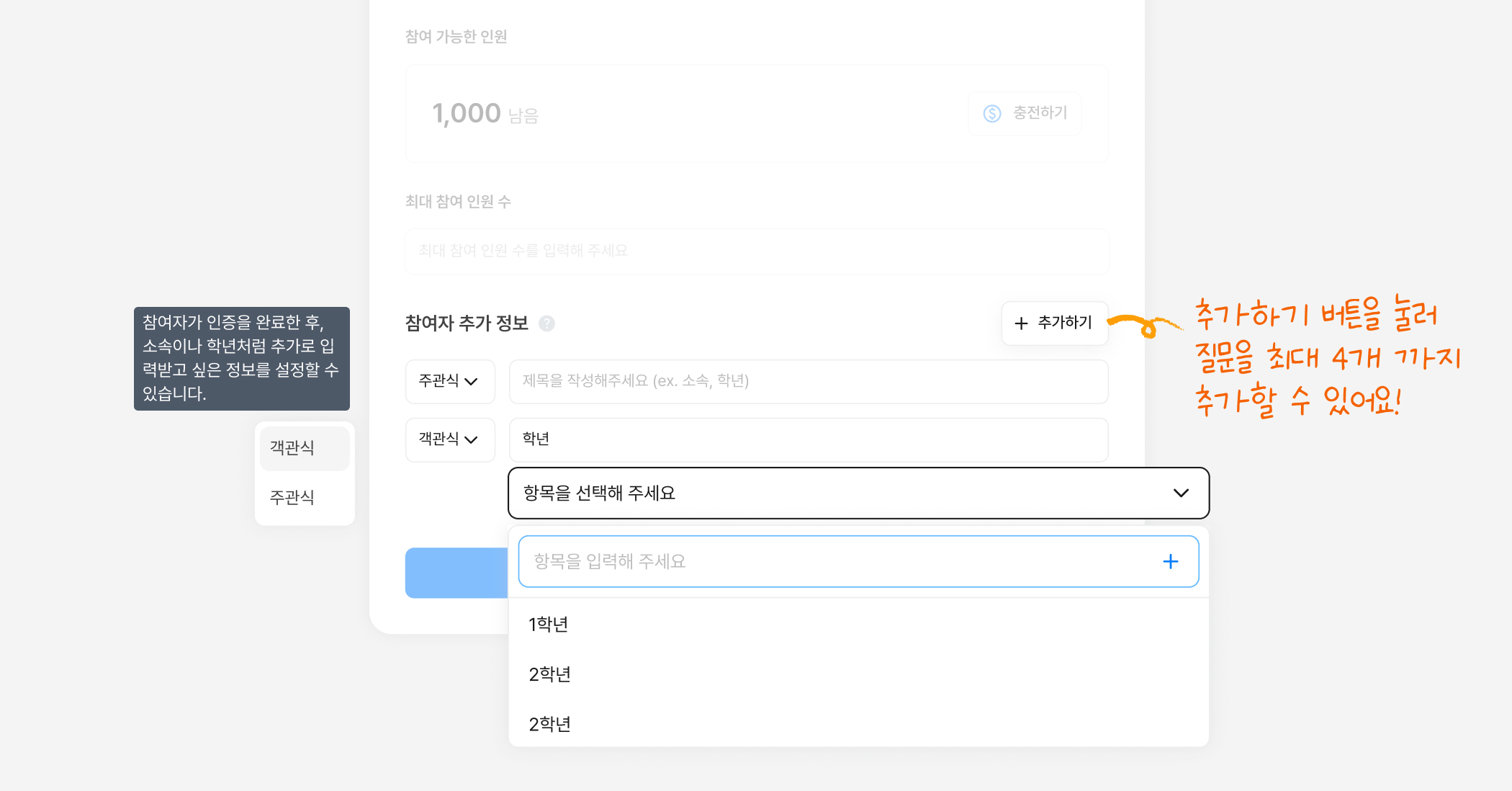 객관식 항목은 관리자가 미리 선택지를 입력해두면 클릭만으로 제출할 수 있고, 주관식 항목은 이메일처럼 자유롭게 입력할 수 있어요