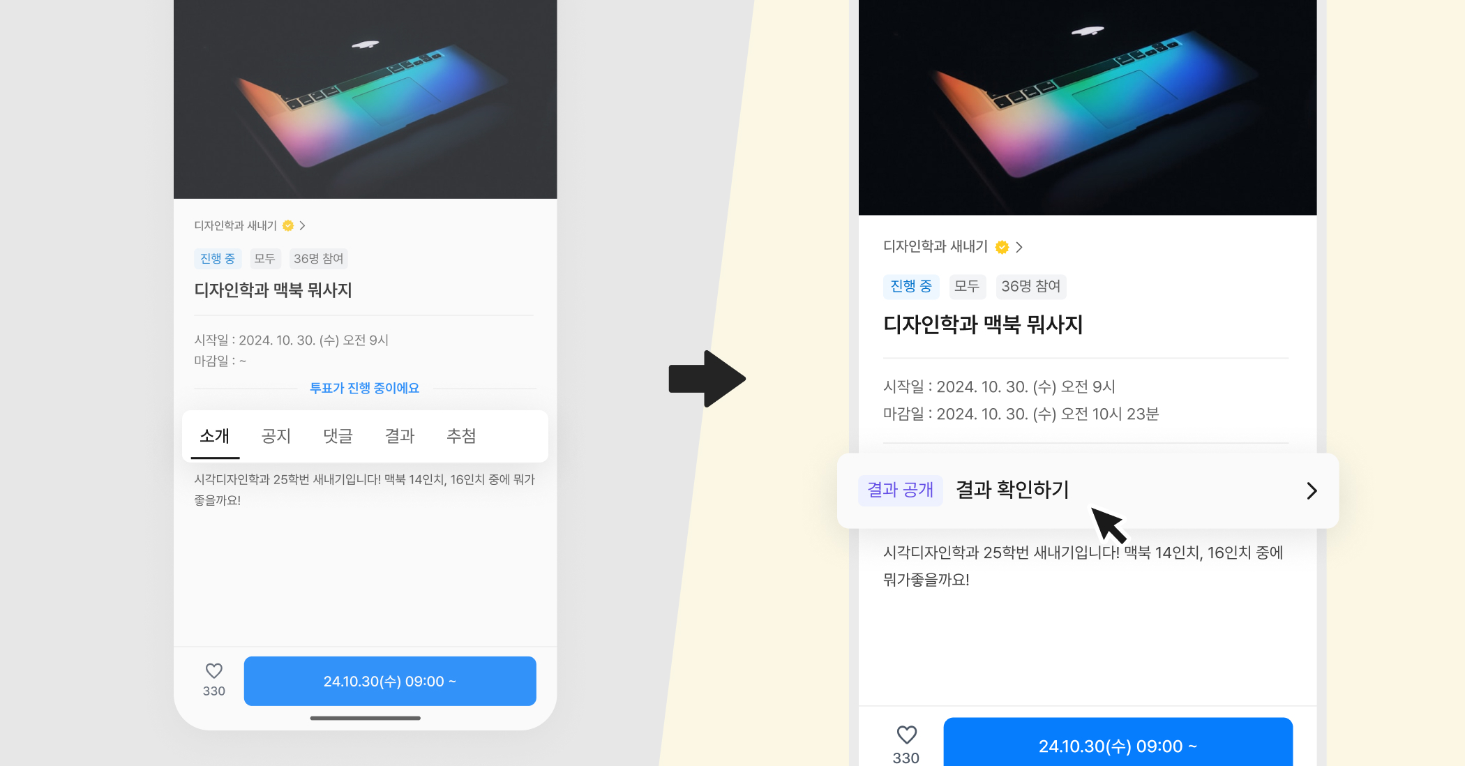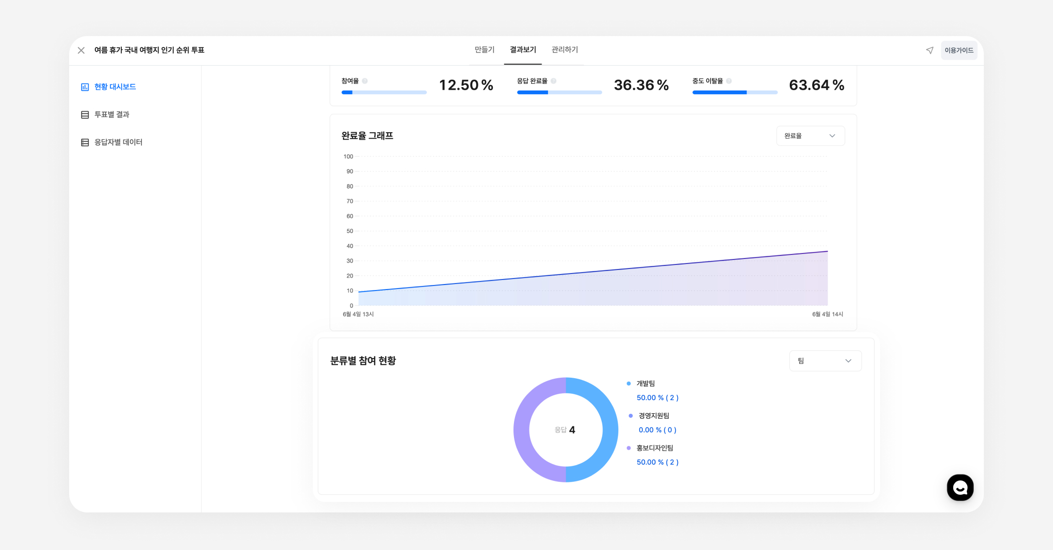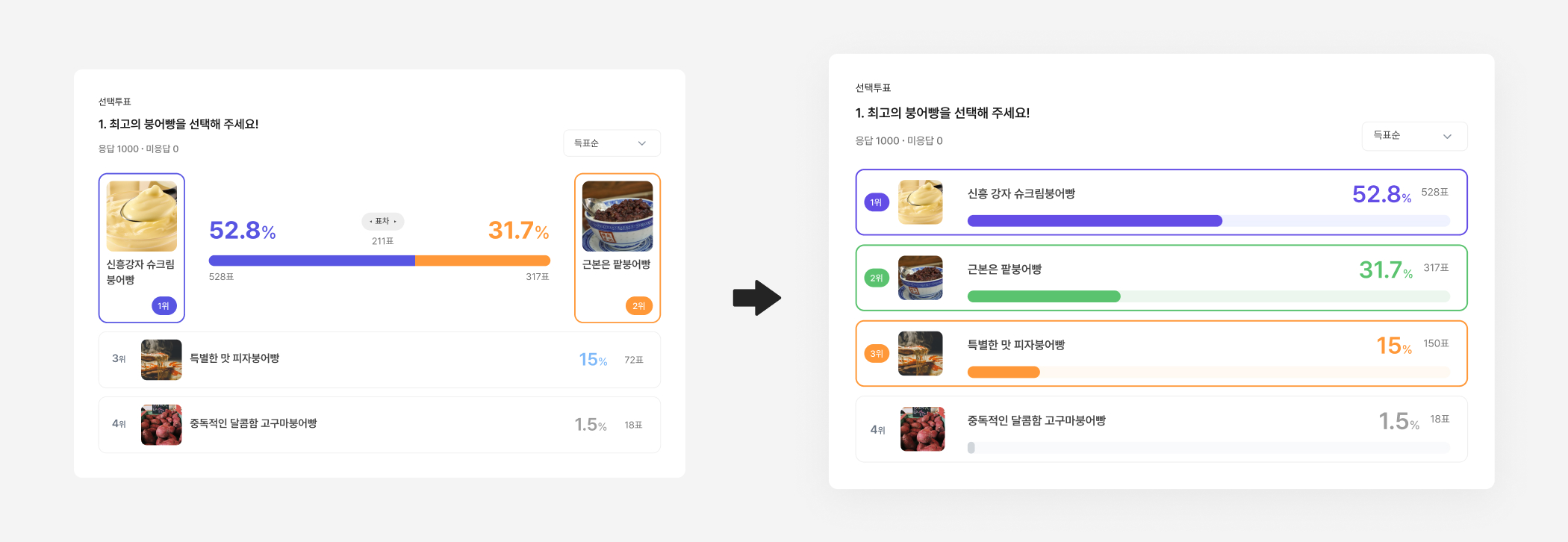투표 결과 화면이 더 명확하고 직관적으로 보여졌으면 좋겠다는 의견을 반영해 결과 페이지를 개선했어요.