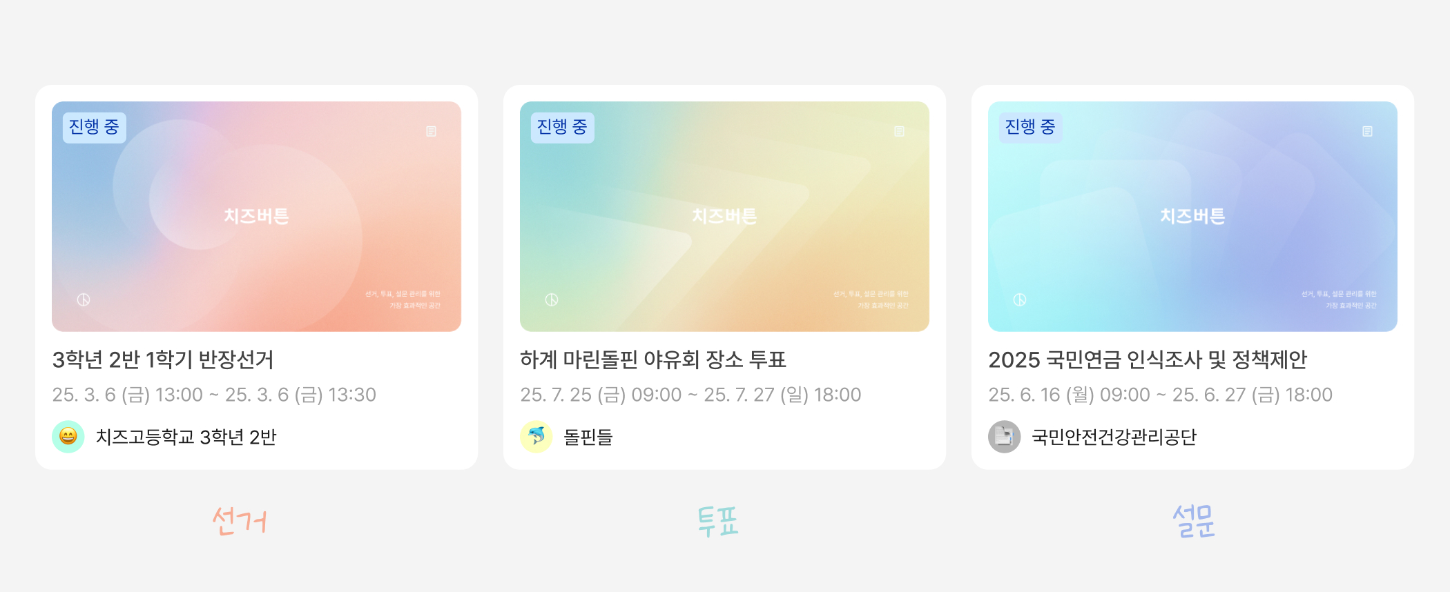 그래서 치즈버튼이 콘텐츠 유형별로 새로운 기본 커버 이미지를 제작했어요! 단순한 디자인을 넘어서, 선거/투표/설문 각각의 목적과 특징이 잘 드러나도록 디자인했어요.