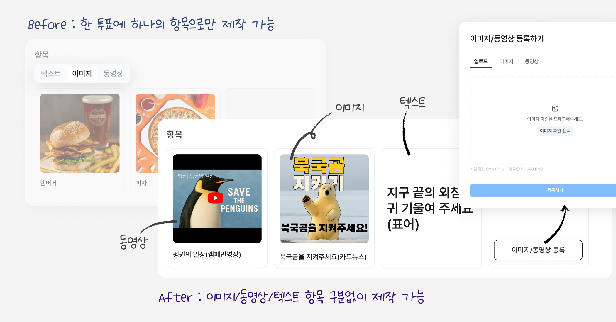 이제 하나의 투표 안에서 이미지, 동영상, 텍스트 항목을 자유롭게 조합할 수 있어요.