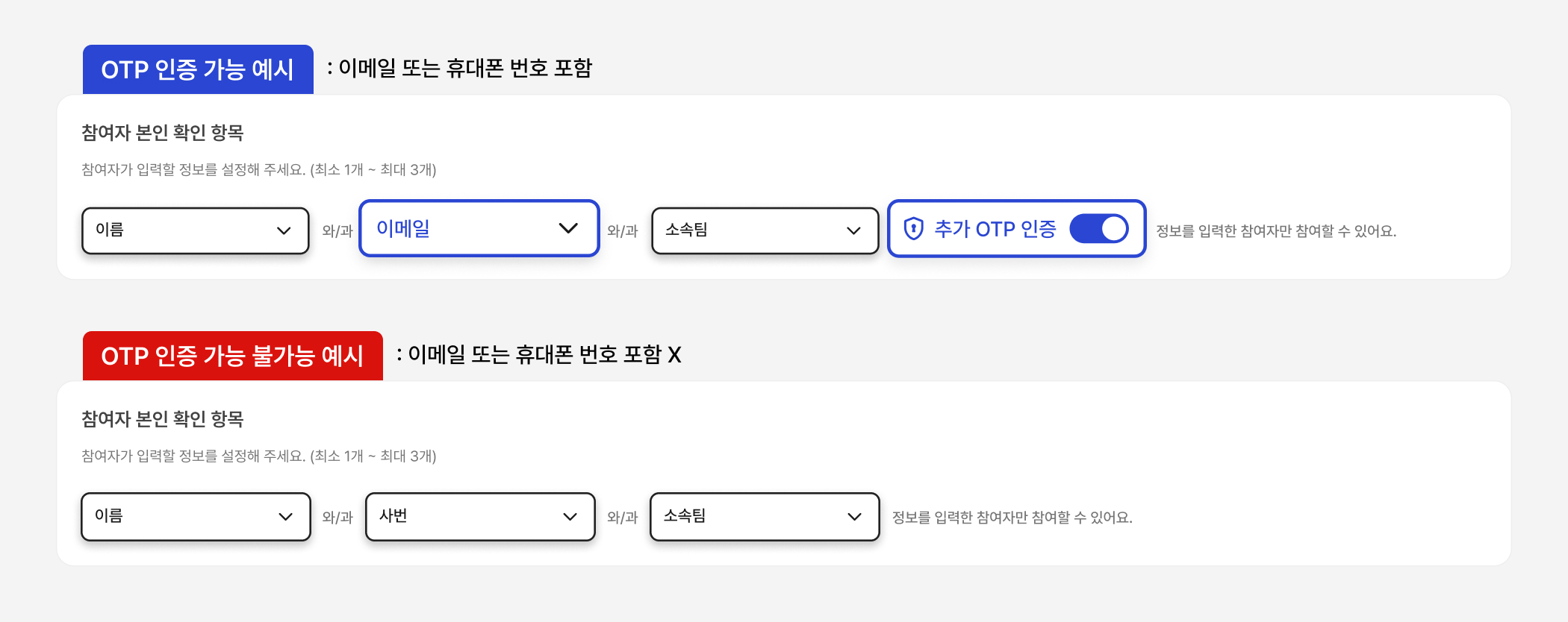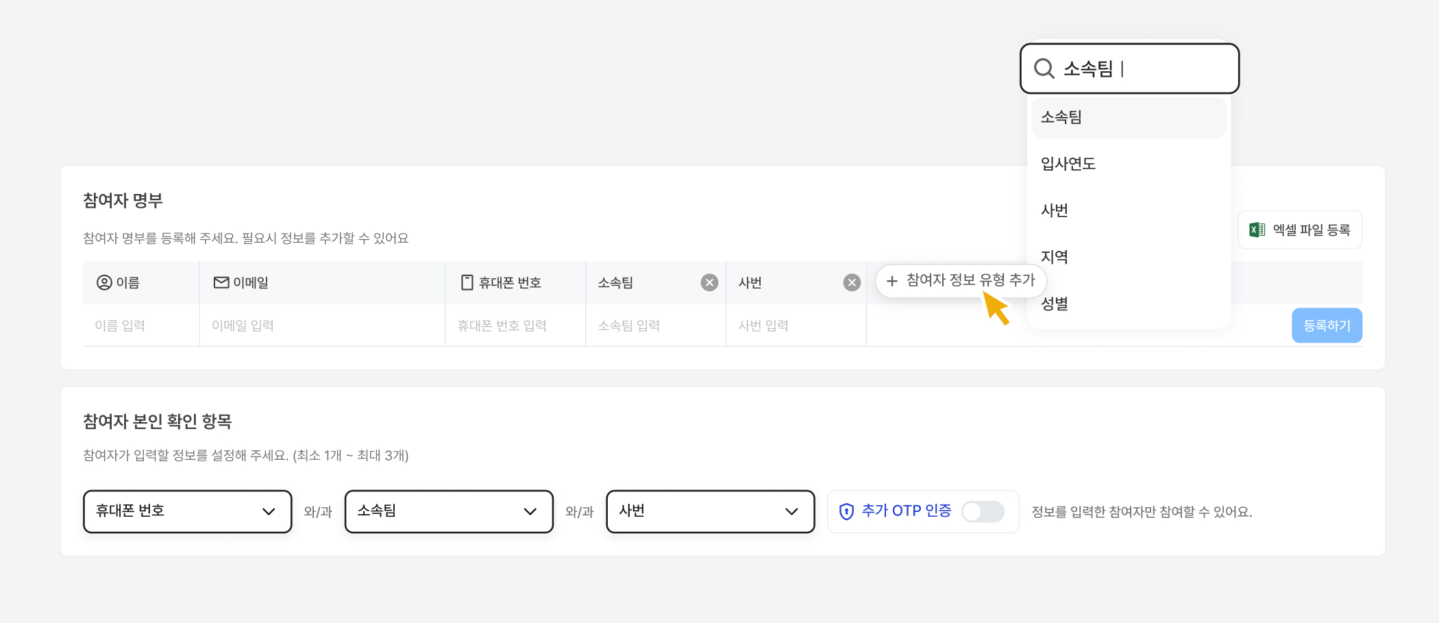기존 명부 인증은 참여자의 전화번호나 이메일 정보를 미리 등록하고 OTP 인증을 필수로 설정해야 했어요.