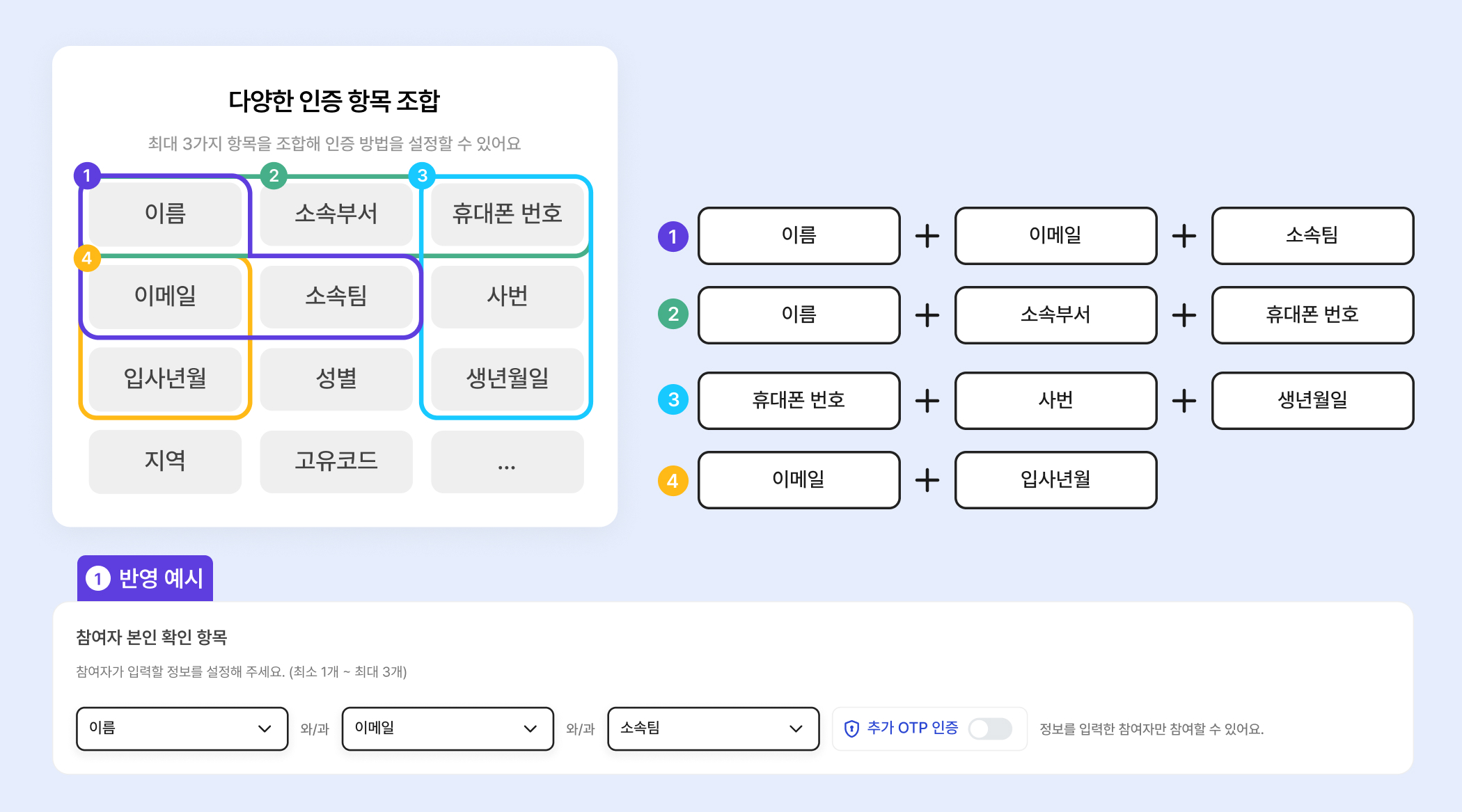 참여자가 본인 확인을 할 때는 최대 3가지 항목을 조합해 인증 기준을 만들 수 있어요. ‘학과 + 학번’, ‘이름 + 사번’, ‘팀명 + 입사연월 + 고유코드’처럼 우리 조직에 딱 맞는 방식으로 유연하게 설정해보세요!
