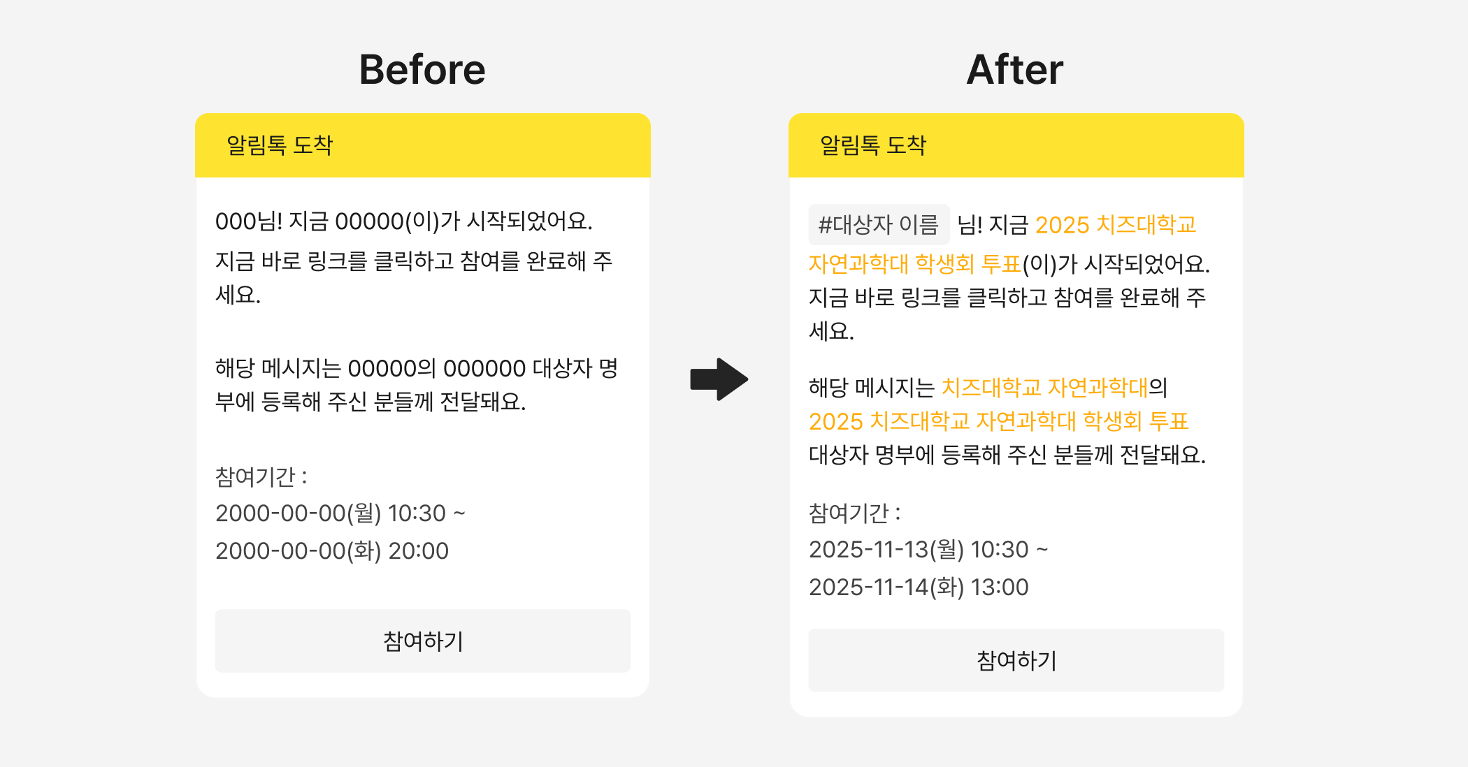 참여자에게 전송되는 카카오 알림톡이나 문자 메시지,
