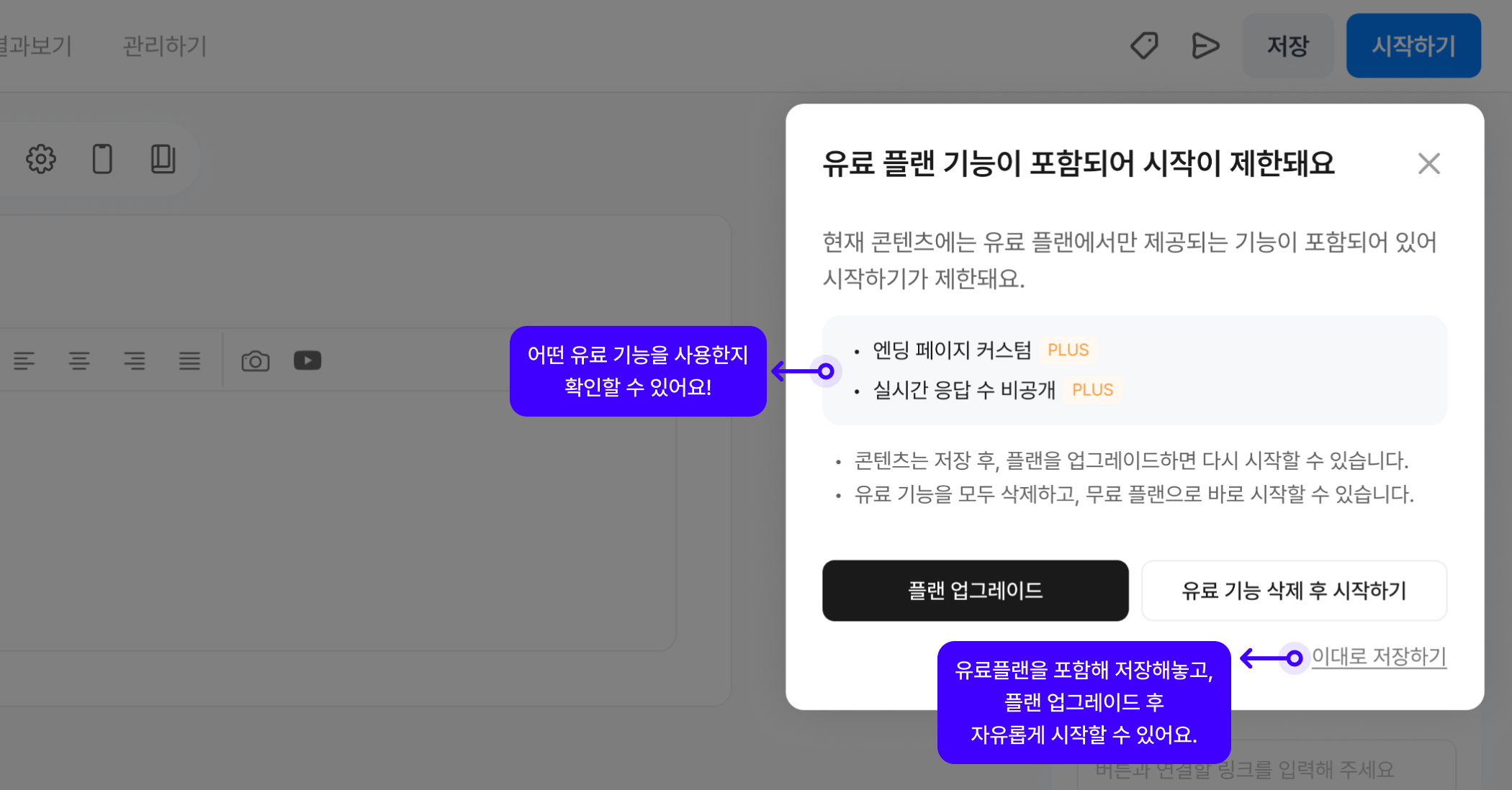제한 기능 명확히 확인: 콘텐츠 시작 시, 어떤 기능 때문에 유료 플랜이 필요한지 명확하게 알려줍니다.