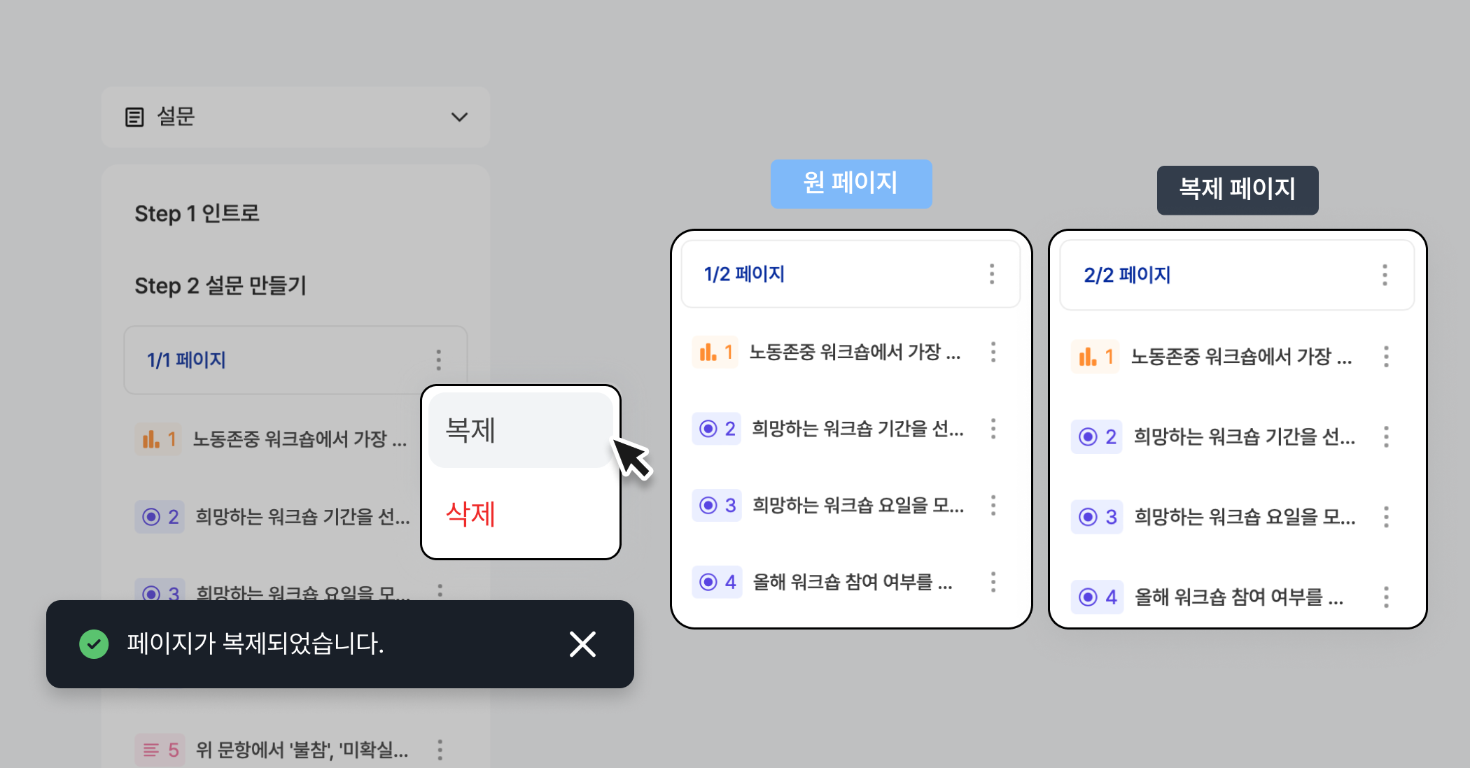 설문 만들기 화면 왼쪽 탭에서 복제하고 싶은 페이지를 선택하세요.