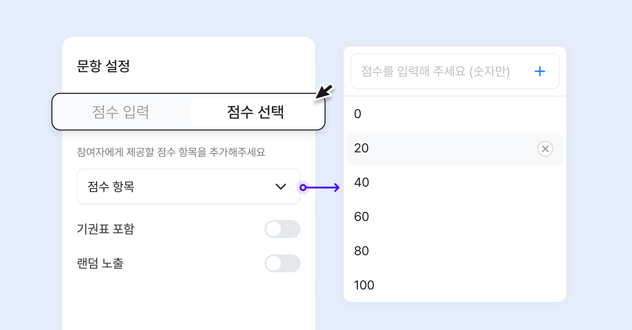 이제 투표 콘텐츠에 점수 입력과 점수 선택 방식이 모두 지원됩니다. 기존에는 참여자가 직접 점수를 입력해야 했지만, 이제 관리자가 미리 정해둔 점수 중에서 선택하게 할 수도 있습니다. 상황에 맞게 두 가지 방식을 유연하게 활용해 보세요.