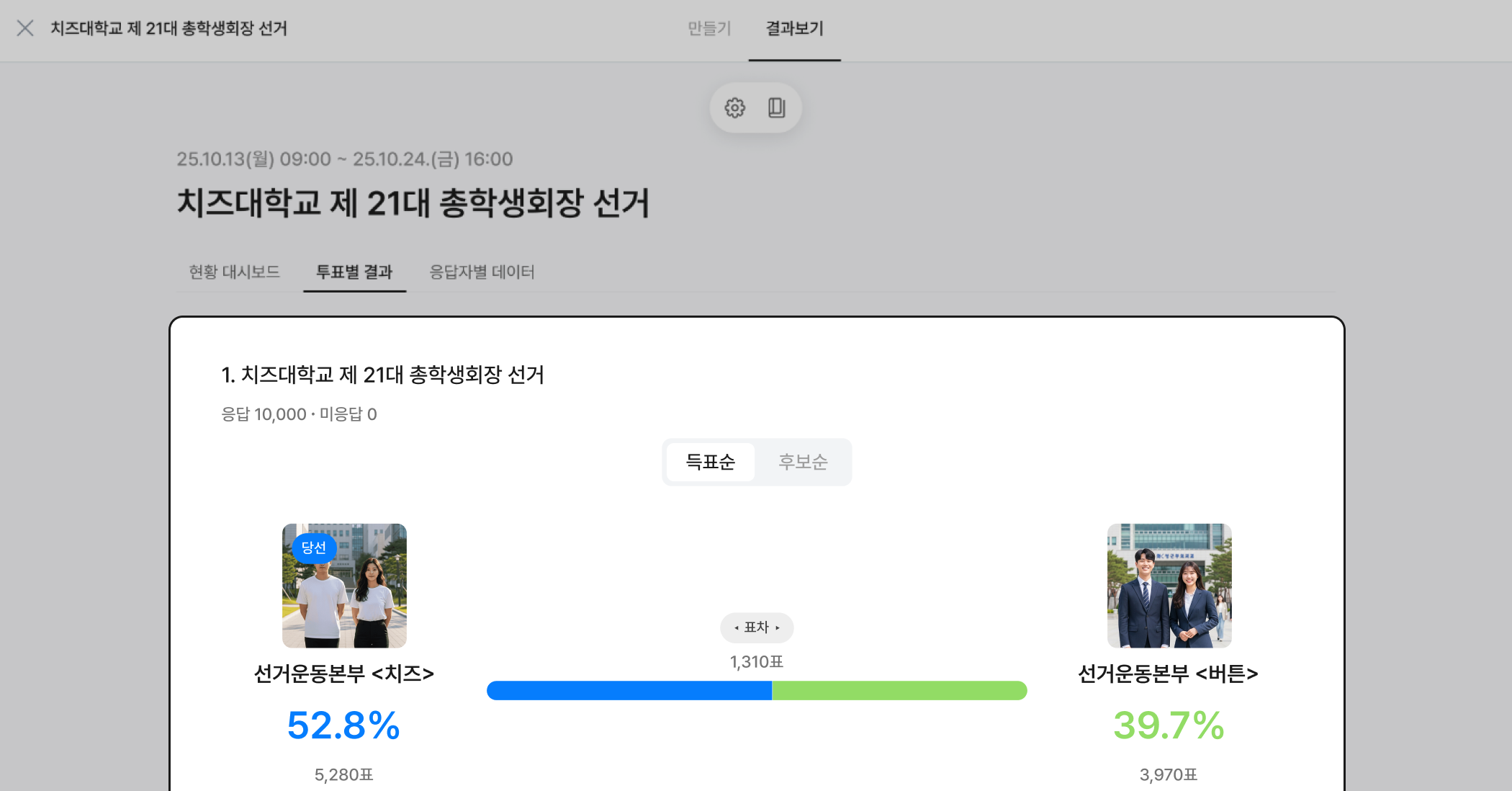 한눈에 들어오는 시각적 정보: 후보별 득표율, 득표수, 순위가 그래프와 함께 정돈되어 한눈에 결과를 파악하기 쉽습니다.