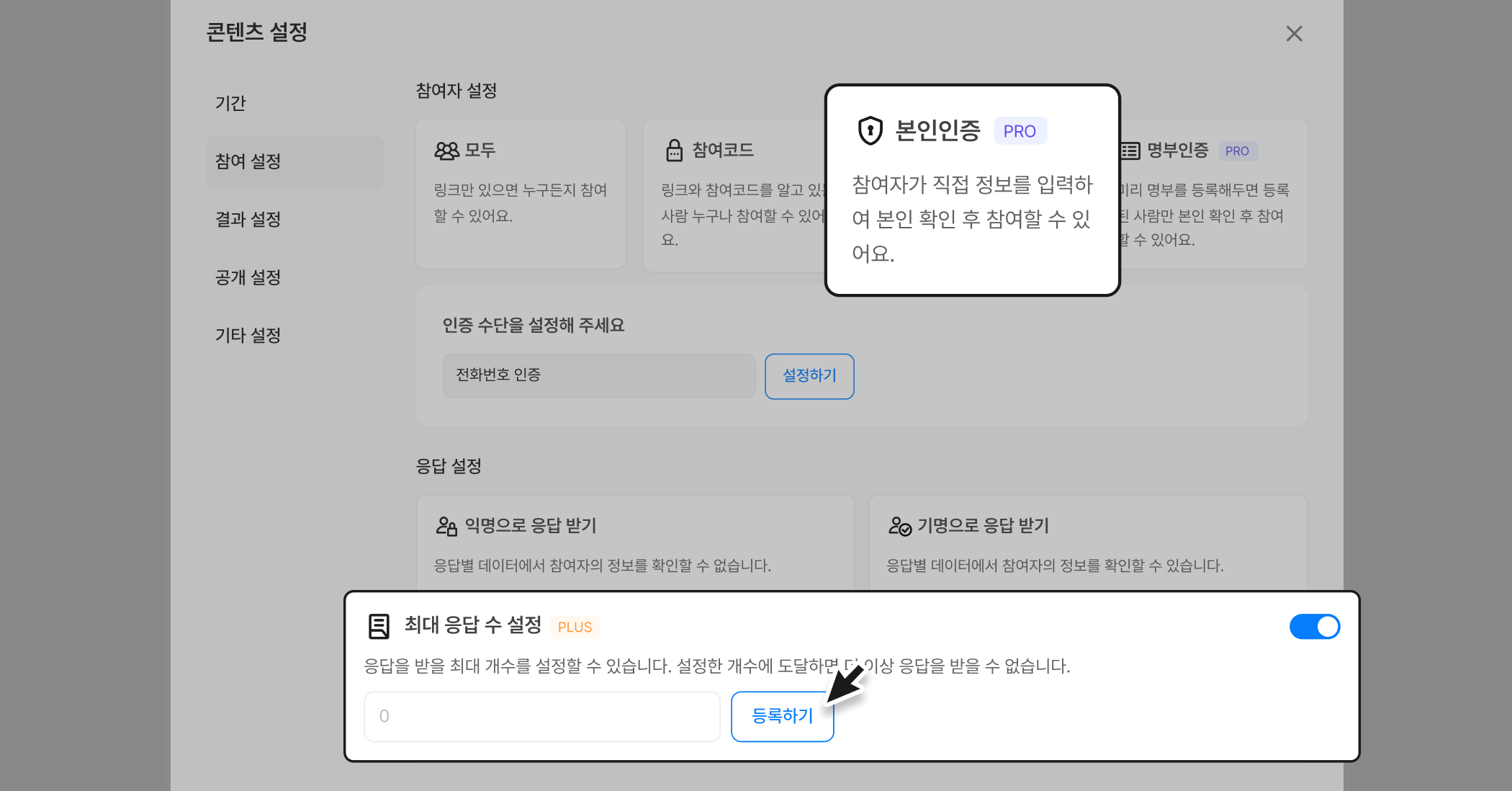 본인 인증 참여 유형의 최대 응답 수를 설정하는 기능의 위치가 이동했어요. [콘텐츠 설정 > 응답 설정]의 최대 응답 수 설정을 ON하면 응답 받을 최대 개수를 설정할 수 있어요.